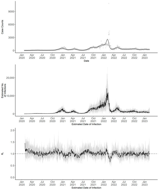 Using the R package incidental (version 0.1), deconvolution was performed on the corrected incident case data to estimate infection dates by accounting for the delay between infection and case reporting. To make this adjustment, we applied the package’s default COVID-19 infection-to-case-report time-lag distribution (mean = 12.75 days, SD = 6.07 days), which is based on a 2020 dataset from Florida [22]. The package implements an empirical Bayes method to fit a regularized likelihood model on a spline basis, which reduces noise and smooths the deconvoluted case count curve. We applied a sequence from 40 to 60, in increments of 2, as the degrees of freedom input in the dof_grid parameter, instead of the default range of 6 to 20, allowing for greater flexibility in spline fitting and supporting a sensitivity analysis across spline configurations. To estimate daily infection counts, 1000 deconvoluted time series were generated. A Poisson-distributed multiplier of 4 was applied to each to account for the underreporting of asymptomatic and mildly symptomatic infections [23,24], resulting in 10,000 time series of estimated daily infections. The median and 95% credible interval (CrI) were then calculated from these time series. Additional sensitivity analyses were performed using multipliers of 3.4 and 4.7, corresponding to the United States CDC’s estimated lower and upper bounds for the number of infections per reported case [25].