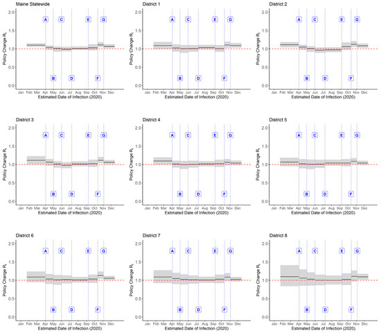 Changes in Rt following major policy interventions for Maine statewide and its eight public health districts in 2020. Labels: A—Stay Healthy at Home Directive (2 April 2020); B—Re-opening (Stage 1) (1 May 2020); C—Gradual Easing of Restrictions (31 May 2020); D—Face Covering Mandate (Certain Businesses) (8 July 2020); E—School Re-opening (8 September 2020); F—Re-opening (Stage 4) (13 October 2020); G—Face Covering Mandate (All Public Settings) (4 November 2020). Some periods, such as the initial lockdown (A) and school reopening (E), showed more pronounced directional changes in certain districts, as reflected in the median Rt estimates.