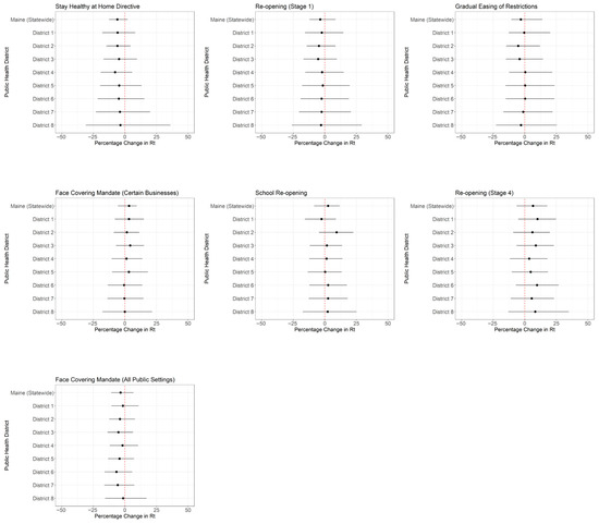 The Maine government implemented a series of NPIs in 2020, spanning seven major policy periods. Following these interventions, Rt estimates remained close to 1 in both statewide and district-level analyses, with wide, overlapping 95% CrIs observed throughout (Figure 3). Percentage changes in policy Rt were also estimated for the state and its eight health districts (Figure 4; Table S3). Median estimates varied in both direction and magnitude across policies and districts. However, for all NPIs, the 95% CrIs crossed zero at both the state and district levels, indicating a high degree of uncertainty.