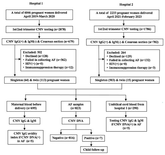During the period of 1 April 2019 to 31 March 2020 in a hospital, a total of 679 pregnant women who were CMV IgG positive and CMV IgM negative, tested in the first or second trimester, and who received a Cesarean section were eligible for the study (Figure 1). Of them, amniotic fluid and cord blood samples were collected from each of the 64 single pregnancies and 113 twin pregnancies with live birth (Figure 1). During the period of 1 April 2021 through 28 February 2023, a total of 782 pregnant women in another hospital were eligible for the study (Figure 1). Of them, amniotic fluid samples were collected from 518 pregnant women (15 twin pregnancies), yet the cord blood samples were not collected (Figure 1). Thus, a total of 695 pregnant women were enrolled, with 567 (81.6%) single pregnancies and 128 (18.4%) twin pregnancies. Their average age was 30.6 ± 4.7 years. The most common indications for Cesarean section were scarred uterus (48.1%) and twin pregnancy (19.7%) (Table S1). Of them, 585 (84.2%) were elective Cesarean sections and 110 (15.8%) were emergency Cesarean sections, and 594 (85.5%) were full-term deliveries and 101 (14.5%) were premature deliveries. The premature delivery rate (55.5%, 76/137) of twin pregnancy was significantly higher than that (4.5%, 25/558) of single pregnancy (χ2 = 230.29, p < 0.001).