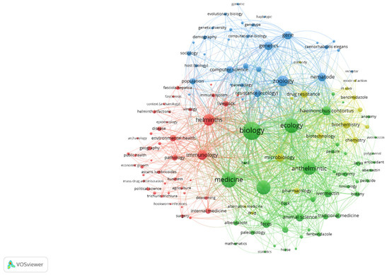 For Figure 1, the options in VosViewer were to search the queries ‘anthelmintic’ and ‘resistance’ in OpenAlex, to perform a full-text analysis, and to create a co-occurrence network visualisation. The size of the spheres and labels was related to the number of times the word occurred. The lines joining words indicate the number of associations between them. Only the main anthelmintics (benzimidazoles and ivermectin) are present in the figure. This figure shows the words associated with anthelmintic resistance: nematode (such as Haemonchus), benzimidazole, and mode of action. The term was also included in more general disciplines, such as zoology and ecology. Anthelmintics are associated with ivermectin, flocks, pasture, and pharmacology but not so much with anthelmintic resistance.