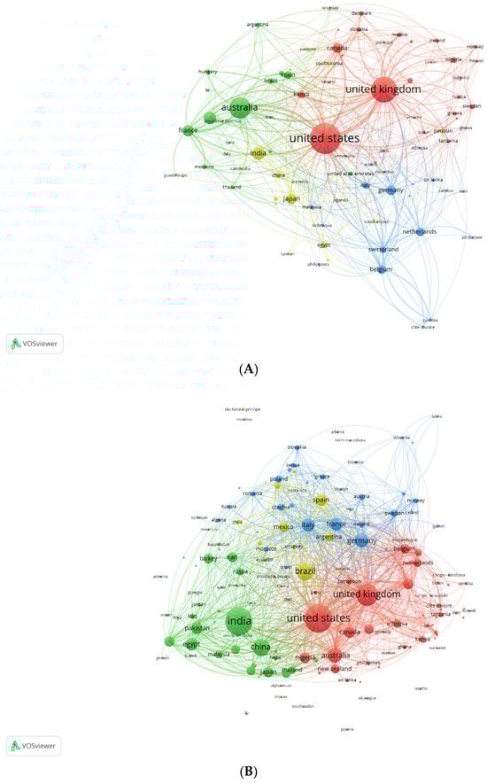 Countries publications on anthelmintics with OpenAlex: (A) 1960–2000 and (B) 2001–2025.