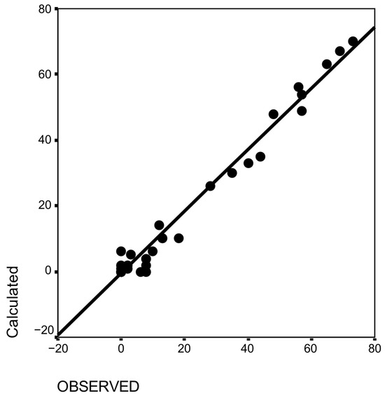 The primary data are presented in Table 1. They were chosen when at least one anthelmintic had a reduced efficacy and when there was an association of anthelmintics tested in each farm. The datasets on resistance are large for anthelmintic resistance in livestock (32,700 on Google Scholar) but our criteria of selection drastically reduced the number of available papers (16). The presence of resistance was indicated when the faecal egg reduction test result was below 90%. The 95% cut-off was utilised in two surveys conducted in New Zealand [37], and a comparison was made between these two cut-offs. The absence of associations between resistances was equally found whatever the cut-off, 90 or 95% efficacy (rs = 0.99, p = 0.001, n = 8 [37]. The observed associations were compared to calculated ones. The latter followed the theorem of composed probabilities, which stipulates that an event A is independent of an event B if the probability of A is independent of B [38]). Therefore, the calculated associations were based on the independence of probabilities of single resistance and are outlined below. Similarly, the independence of three events (A, B, C) is determined by the condition that their joint probability is equivalent to the product of their individual probabilities. The calculated probability of association between Bz (Benzimidazoles) and Lev (Levamisole) resistance in Table 1 was determined by multiplying the frequency of Bz resistance in farms by the frequency of Lev resistance in farms. For instance, in survey one (Table 1), this is 0.56 × 0.53, i.e., 0.30 or 30%. This was then compared with an observed value of 35%. The differences between expected and observed frequencies were subjected to a statistical evaluation using a chi-square test. Their relation was also evaluated with a Spearman rho (rs).
