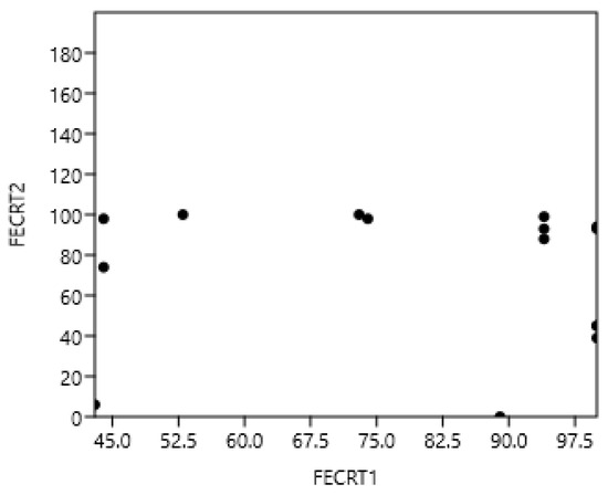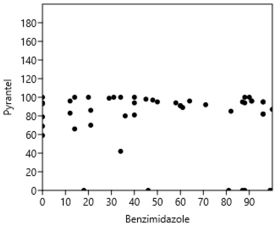The Spearman correlations between FECRT of the three drugs (rs = −0.03, n = 22, p = 0.92) were not significant (Figure 5). The correlations between benzimidazoles and pyrantel (rs = −0.12), benzimidazoles and ivermectin (rs = −0.22), and pyrantel and ivermectin (rs = 0.54) were not significant.