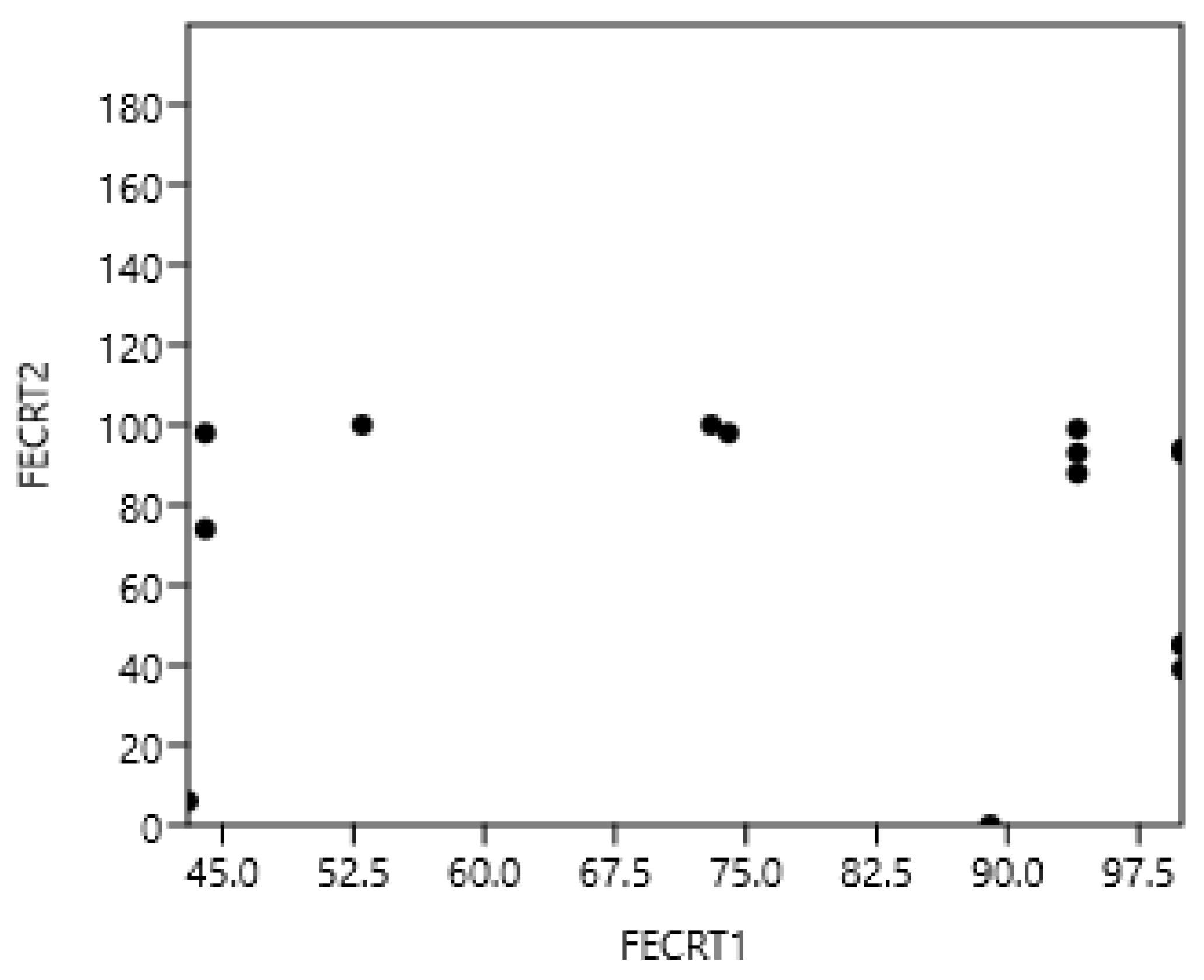 - Cristel, S.L.; Suárez, V.H. Resistencia antihelmíntica: Evaluación de la prueba de reducción del conteo de huevos. Rev. Investig. Agropecu. 2006, 35, 29–43. [Google Scholar]