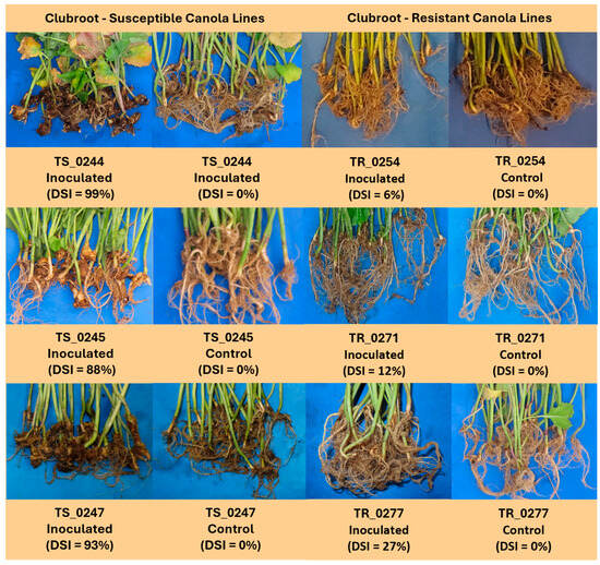 The disease assessments conducted at 42 dai indicated a significant impact of P. brassicae on CS canola lines, with DSI values ranging from 88% to 99% (Figure 1). In contrast, inoculated CR canola lines exhibited substantially lower DSI values, ranging from 6% to 27%, confirming their resistance to the pathogen. No symptoms were observed in the non-inoculated control plants (DSI = 0%), demonstrating both the effectiveness of the control treatments and the specificity of the inoculation procedure.