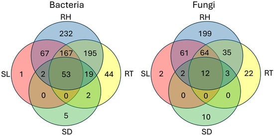Venn diagram representing bacterial and fungal genera associated with the soil mixture (SL), rhizosphere (RH), roots (RT), and seeds (SD) of three clubroot-susceptible canola lines (TS244, TS245, and TS247), and three clubroot-resistant canola lines (TR254, TR271, and TR277).