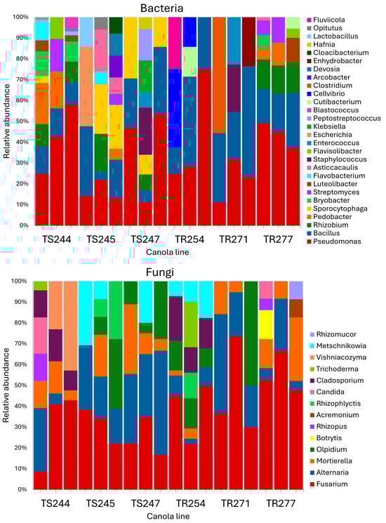 Relative abundance of bacterial and fungal genera in seed samples (N = 3) from clubroot-susceptible canola lines (TS244, TS245, and TS247) and clubroot-resistant canola lines (TR254, TR271, and TR277), as determined by high-throughput sequencing of 16S rRNA and ITS amplicons. Seed samples (1 g) from each canola line were collected before the experiment started to evaluate their baseline microbial composition.