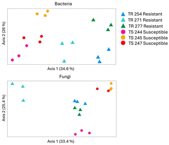 Principal coordinates analysis (Bray–Curtis) of bacterial and fungal communities in seed samples (N = 3) of clubroot-resistant (TR254, TR271, and TR277) and clubroot-susceptible (TS244, TS245, and TS247) canola lines. Seed samples (1 g) from each canola line were collected before the experiment started to evaluate their baseline microbial composition using high-throughput sequencing of 16S rRNA and ITS amplicons.