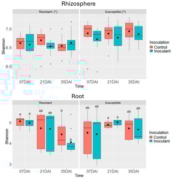 Estimated Shannon’s diversity index of bacterial communities associated with rhizosphere samples and root samples (N = 3) of clubroot-resistant (TR254, TR271, and TR277) and clubroot-susceptible (TS244, TS245, and TS247) canola lines. Plants were harvested at 7, 21, and 35 days after inoculation (dai) with Plasmodiophora brassicae (pathotype 3A). Non-inoculated plants served as controls. Different letters denote significant differences (p < 0.05) between treatment means based on Tukey’s test. Asterisks (*) indicate statistically significant differences between the overall Shannon index means of the clubroot-susceptible and clubroot-resistant canola lines in the rhizosphere.