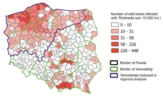 - Bilska-Zając, E.; Różycki, M.; Korpysa-Dzirba, W.; Bełcik, A.; Ziętek-Barszcz, A.; Włodarczyk-Ramus, M.; Gontarczyk, A.; Cencek, T. Trichinella outbreaks on pig farms in Poland in 2012–2020. Pathogens 2021, 10, 1504. [Google Scholar] [CrossRef]