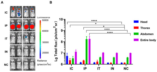 Bioluminescence in golden hamsters following rHeV-F/G pseudovirus infection via IC, IT, IP, and IN routes. (A) rHeV-F/G pseudovirus challenge via IC, IT, IP, and IN routes, followed by injection of D-luc luminescent substrate at 6 h post-challenge. Luciferase bioluminescence was detected and imaged utilizing the IVIS Spectrum CT imaging system, n = 4 hamsters per group. The luminescence intensity label displayed ranges from 1.5 × 104 to 5 × 104 p/s/cm2/sr. (B) Different ROIs were set for the head, thorax, abdomen, and entire body, respectively, and radiance signals were collected using the IVIS Spectrum CT system. Statistical analyses were performed on the log-transformed values of the total fluxes for the different challenge routes, with four independent biological replicates of the data in each group, and compared with the NC group separately. One-way ANOVA was applied. Data are expressed as the mean ± SD. * p < 0.05, **** p < 0.001.