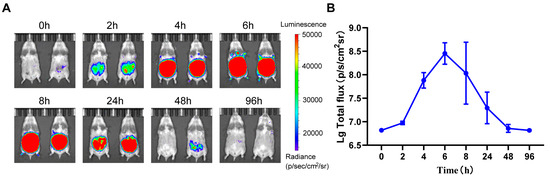 After identifying intraperitoneal injection as the optimal challenge route for rHeV-F/G pseudovirus in golden hamsters, the optimal luminescence detection time following pseudovirus challenge was further assessed. The fixed challenge dose of 1.0 × 106 TCID50 was utilized, and the results of the post-challenge interval testing are displayed in Figure 2A. The intensity of bioluminescence exhibited a gradual increase over time following the challenge. The maximal luciferase bioluminescence intensity was detected at 6 h post-challenge, with an average luminescence intensity of 3.03 × 108 (p/s/cm2/sr). Thereafter, the luminescence gradually decreased until 96 h, at which point it was essentially undetectable (Figure 2B). In light of the aforementioned results, it was determined that the optimal luminescence detection time for the evaluation of rHeV-F/G pseudovirus infection in the golden hamster model was 6 h after challenge.