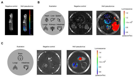 In vivo biodistribution analysis after rHeV-F/G pseudovirus challenge. (A) Golden hamsters challenged with rHeV-F/G pseudovirus via the IP route were subjected to CT bioluminescence imaging to demonstrate the distribution of luciferase luminescence in vivo 6 h after infection. The negative control hamster was not challenged but only injected with luminescent substrate and imaged in the same way. The luminescence intensity label displayed ranges from 1.6 × 105 to 7.8 × 105 photons/s. (B) The left panel illustrates the arranged positions of the heart, liver, spleen, lungs, kidneys, and intestines, the middle panel shows the bioluminescence of the abdominal organs of a golden hamster in the NC group, and the right panel shows the bioluminescence of the abdominal organs of a rHeV-F/G pseudovirus-challenged golden hamster. The luminescence intensity label displayed ranges from 5 × 105 to 1.5 × 106 p/s/cm2/sr. (C) The left panel illustrates the arranged positions of the brain, lungs and intestines, the middle panel shows the bioluminescence of the abdominal organs of a golden hamster in the NC group, and the right panel shows the bioluminescence of the abdominal organs of a rHeV-F/G pseudovirus-challenged golden hamster. The luminescence intensity label displayed ranges from 5 × 105 to 1.5 × 106 p/s/cm2/sr.