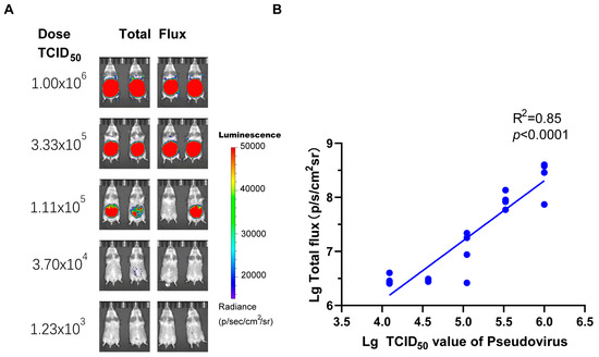Correlation of bioluminescence intensity with the rHeV-F/G pseudovirus challenge dose. (A) Pseudovirus challenge was performed by intraperitoneal injection at a 3-fold gradient dilution with a maximum starting dose of 1.0 × 106 TCID50, n = 4 hamsters per group. The luminescence intensity label displayed ranges from 1.5 × 104 to 5 × 104 p/s/cm2/sr. (B) The log-transformed values of the TCID50 values of the injected pseudovirus dose and the log-transformed values of the total luminescence intensity of each group were subjected to a linear regression analysis, and a robust correlation was demonstrated (R2 = 0.85, p < 0.001).