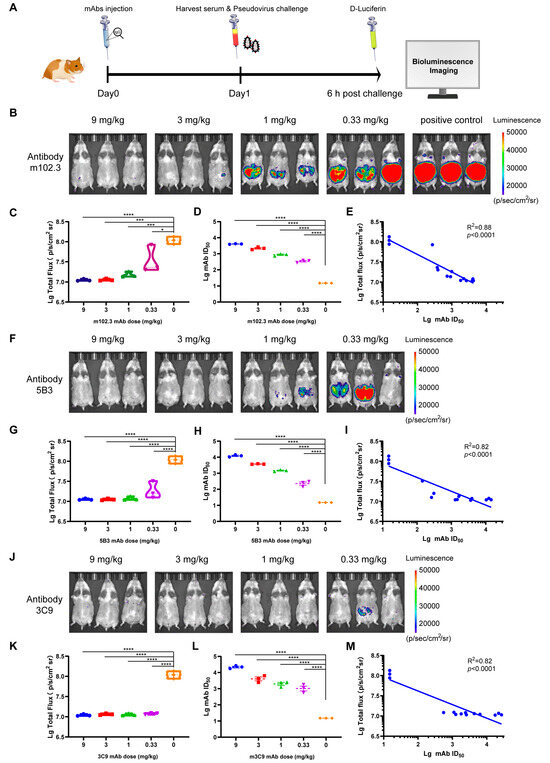 For the animal protection assay, monoclonal antibodies (mAbs) m102.3, 5B3, and 3C9 were serially diluted in phosphate-buffered saline (PBS) in a 3-fold gradient, one day prior to the challenge. The mAbs were then administered via the intramuscular route with doses of 9 mg/kg, 3 mg/kg, 1 mg/kg, 0.33 mg/kg, and 0 mg/kg according to the weight of the animals. Each dose group contained three golden hamsters. Pseudovirus challenge was performed via the IP route at a dose of 6.41 × 105 TCID50, and the hamsters were tested for bioluminescence 6 h after challenge.