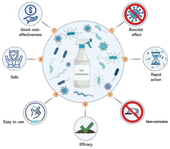 Schematic representation of the key features for the development of new disinfectants (created by Biorender).