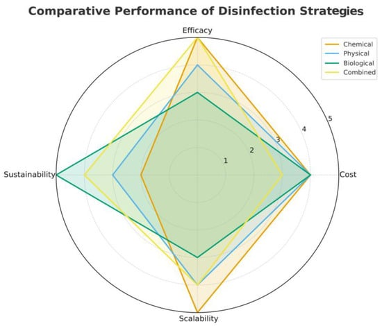 To visualise the differences among the main C&D approaches analysed in this review, a radar chart (Figure 2) was developed to compare chemical, physical, biological and combined methods across four key criteria: efficacy, cost, scalability, and sustainability.
