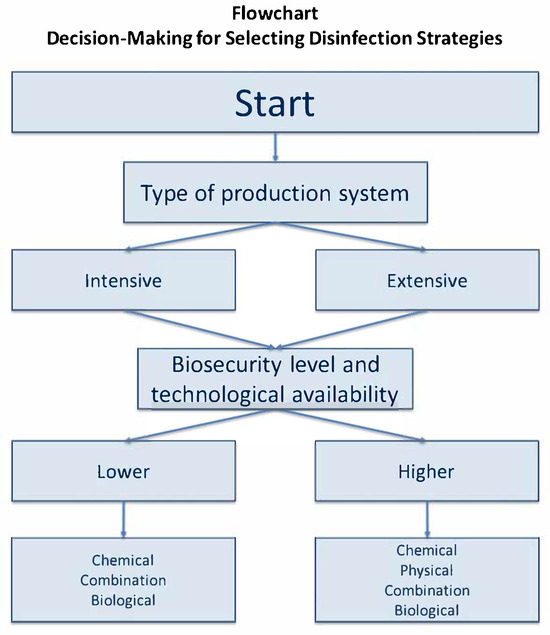 How can we choose the best method? To this end, we propose a flowchart that can serve as a reference for selecting the most suitable method (Figure 3). The diagram illustrates the steps to consider when choosing C&D methods. The sequence starts with identification of the type of farm, followed by the level of biosecurity and the resources available on the farm, in order to select the most appropriate approach: chemical, physical, combined chemical-physical or biological.