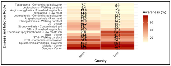 Awareness of infection route and symptoms was significantly different between Japanese and Laotian students. Laotian students demonstrated a greater awareness of transmission routes for endemic parasitic infections, such as taeniasis (64.2% vs. 8.8%) and opisthorchiasis (65.4% vs. 45.9%), while both groups frequently identified vectors as the transmission route for dengue and malaria. Awareness was significantly higher among Japanese students for angiostrongyliasis-unwashed vegetables (13.9 vs. 7.9%), toxoplasma-raw meat (14.4% vs. 7.5%), JE-vector (30.2% vs. 14.2%), strongyloidiasis-contaminated soil (33.1% vs. 13.4%), and STH-contaminated soil/water (60.8% vs. 34.6%) disease-route pairs (Figure 1).