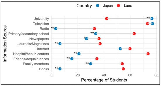 Sources of information about infectious diseases among nursing students in Japan (n = 187) and Laos (n = 254). Blue (Japan) and red (Laos) points indicate the percentage of students reporting each source (multiple answers allowed). Statistically significant differences between groups were assessed using the chi-square test or Fisher’s exact test (* p < 0.05, ** p < 0.001).