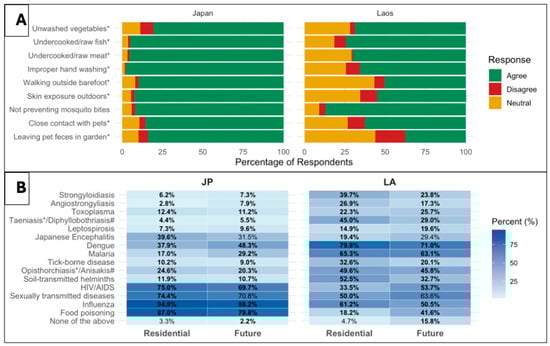 Attitudes toward transmission routes and perceived importance of infectious diseases among nursing students in Japan (JP) and Laos (LA). Panel (A): Attitudes toward infectious disease transmission routes among nursing students in Japan and Laos. Responses are shown as stacked proportions of ‘Disagree,’ ‘Neutral,’ and ‘Agree,’ calculated based on the total number of responses for each item (Japan: 187–188; Laos: n = 254). Statistically significant differences between countries were identified using the chi-square test or Fisher’s exact test (p < 0.05) and are indicated with an asterisk (*) next to the raw label. Panel (B): Perceived importance of infectious diseases in the residential area and in the future. The heatmap shows the percentage of students selecting each disease as a disease that should be given priority in their residential area and in the future (multiple responses were allowed). Darker shades represent higher proportions of students selecting the disease. Values in bold indicate statistically significant differences between the two countries, identified using the chi-square test or Fisher’s exact test (p < 0.05). * Item included only in the Laos questionnaire, # Item included only in the Japanese questionnaire.