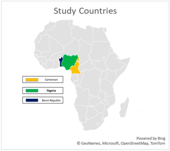 Samples were collected from cattle from three countries (Nigeria, Cameroon and Benin). Nigeria shares boundaries with both Cameroon and Benin (Figure 1). The sampled animals were from farms, cattle markets and abattoirs. These locations were areas where contact or local veterinarians reported cases of cattle with pox-like lesions. The sampling activity was done by experienced veterinarians who purposefully sampled animals with skin nodules of varying sizes, severity and stages, typical of LSD. Samples collected include skin scabs, nodule aspirates, and oral and nasal swabs (the oral and nasal swabs were pooled into one sample for each animal). Collected samples were stored in DNA/RNA shields and transferred into mobile freezers (−4 °C). Then, they were transported to the Institute for Genomics and Global Health (IGH), Redeemer’s University, Ede, Nigeria, and stored at −80 °C until laboratory analysis.