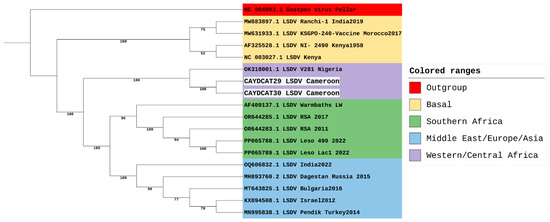 Phylogenetic analysis was done using a final dataset of 34 sequences, consisting of the two study sequences from Cameroon and 32 sequences retrieved from the NCBI virus database. These 32 sequences were selected as representatives from the different LSDV clusters as outlined by [34]. The multiple sequence alignment was performed using the online MAFFT tool (MAFFT alignment and NJ/UPGMA) [35]. The maximum likelihood tree was constructed using IQTREE2 [36], and iTOL (Interactive Tree of Life) was used for visualisation and annotation [37].