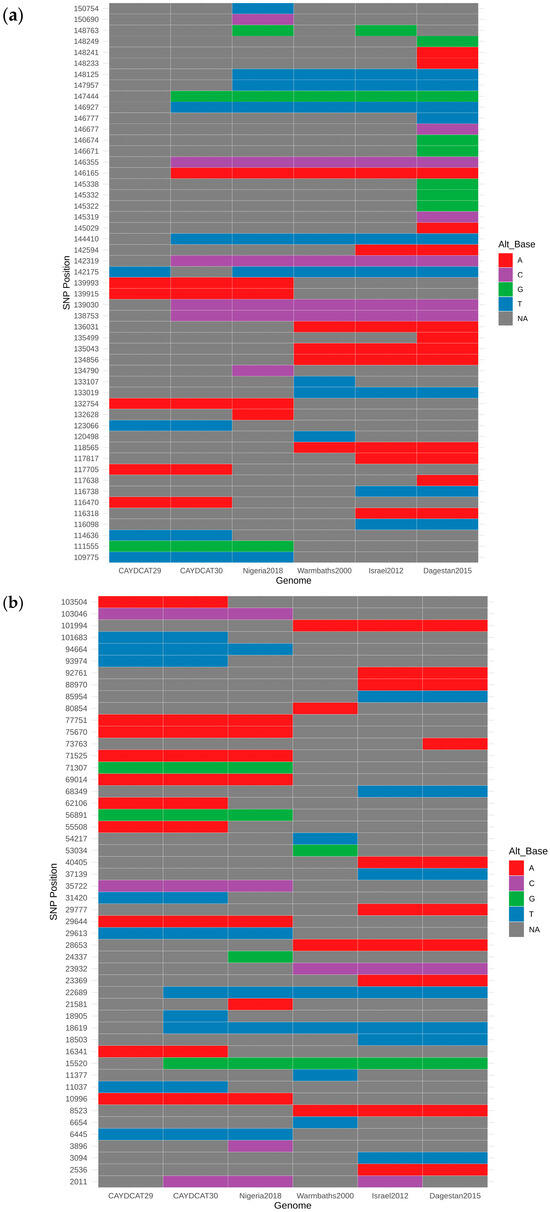 (a,b) SNP heatmaps showing 101 genomic positions with variation across the six compared LSDV genomes. Each column represents an individual genome, and each row represents a SNP locus (each nucleotide is represented by a specific colour, and NA is used when an SNP is absent). CAYDCAT29 and CAYDCAT30 exhibited nearly identical SNP patterns, with a high degree of overlap with the Nigeria 2018 strain.