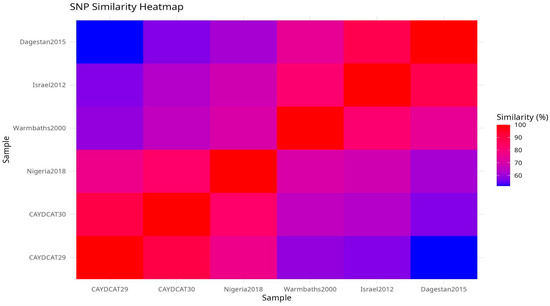 To explore overall genomic similarity, we constructed a heatmap (Figure 5) using the Jaccard similarity coefficient, which quantifies the proportion of shared SNPs relative to the total set of unique SNPs between genome pairs. This approach captures both convergent and divergent SNP signatures across the genomes. CAYDCAT29 and CAYDCAT30 exhibited the highest similarity (>85%), consistent with a shared origin. Both genomes also have close SNP patterns with Nigeria2018 (Jaccard similarity between 75 and 85%), further supporting their placement within a Central/West African subset of LSDV cluster 1.2. In contrast, Warmbaths2000, Israel2012, and especially Dagestan2015 showed lower similarity to the Cameroonian LSDV genomes (Jaccard indices < 62%), suggesting more distant evolutionary relationships. These patterns confirm that the Cameroonian strains are genetically distinct but most closely related to Nigeria2018, supporting the hypothesis of regional continuity in virus evolution within cluster 1.2.