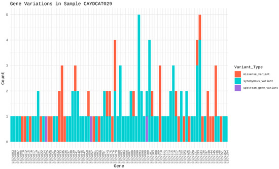 Gene variation profile in sample CAYDCAT29. Distribution of gene variants across all genes, showing the count of missense variants, stop gained, synonymous variants, and upstream gene variants.