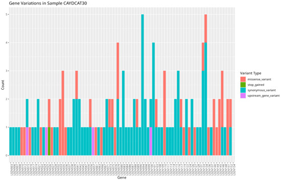 Gene variation profile in sample CAYDCAT30. Distribution of gene variants across all genes, showing the count of missense variants, stop gained, synonymous variants, and upstream gene variants.