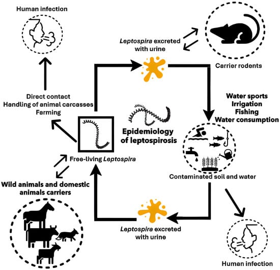 The incubation period for leptospirosis typically ranges from 7 to 14 days, though it can vary between 2 and 30 days. The majority (approximately 90%) of human infections are either asymptomatic or present with mild flu-like symptoms. However, severe forms can occur, potentially leading to life-threatening complications such as pulmonary hemorrhage, liver and kidney failure (Weil’s disease), as well as meningitis, pancreatitis, or encephalitis [18]. Transplacental transmission may also occur, resulting in abortion or stillbirth [18] (Figure 1). In animals, leptospirosis can cause a range of clinical manifestations and pathological changes. In calves, infection may result in hemolytic anemia and hemoglobinuria, with interstitial nephritis as a sequela, and late-term abortion in cows (combined for clarity). In dairy cows, mastitis syndrome and occasional abortions may occur. In pigs, the most significant losses arise from abortions, stillbirths, neonatal mortality, and interstitial nephritis (reworded for conciseness) [23]. In dogs, most infections are subclinical; however, symptomatic cases are characterized by lethargy, fever, anorexia, and polyuria/polydipsia, which may progress to multiple organ dysfunction, including acute kidney injury, cholestatic liver dysfunction, pancreatitis, varying degrees of pulmonary hemorrhage, myositis, and occasionally uveitis [24]. In horses, the disease may manifest as febrile illness, reproductive losses, and neonatal disease [24,25,26].