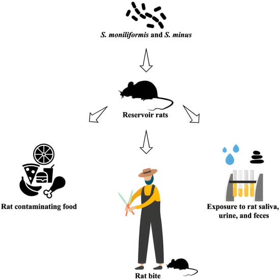 Rats harbor S. moniliformis in their oral cavity and throat, typically without exhibiting symptoms. The bacteria spread easily among rats through social interactions, although stressed or injured rats may develop abscesses or other bacterial infections [37]. House mice (Mus musculus) can contract S. moniliformis only through contact with infected rats, but they do not play a significant role in the epidemiology of human RBF. Susceptibility among mouse strains varies, with some developing fever, arthritis, abscesses, and septicemia upon infection [38].