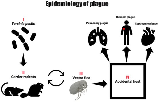 The plague can be transmitted from a patient with pneumonic plague to other individuals through droplet transmission [70,71,72]. In addition to aerosol transmission, contact between susceptible individuals and infected tissue, whether of animal or human origin, poses a high risk of infection to humans. Contagion by direct contact could cause a contained spread to occur among relatives and close communities of people who take care of their dead [73]. In the environment, approximately 80 species of fleas can be infected with the bacterium [74], which is considered the most efficient method of transmission [75].