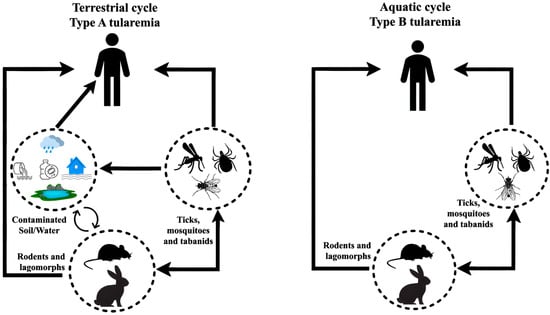 - Hennebique, A.; Boisset, S.; Maurin, M. Tularemia as a Waterborne Disease: A Review. Emerg. Microbes Infect. 2019, 8, 1027–1042. [Google Scholar] [CrossRef] [PubMed]