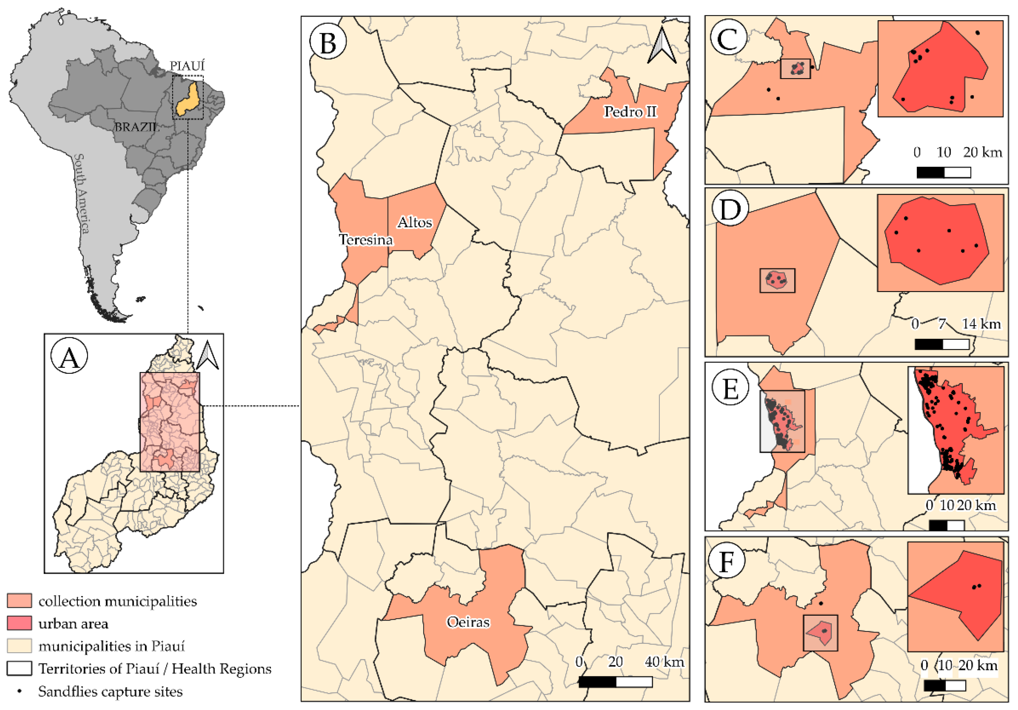 - Andrade-Filho, J.D.; da Silva, A.C.L.; Falcão, A.L. Phlebotomine sandflies in the State of Piauí, Brazil (Diptera: Psychodidae: Phlebotominae). Mem. Inst. Oswaldo Cruz 2001, 96, 1085–1087. [Google Scholar] [CrossRef]