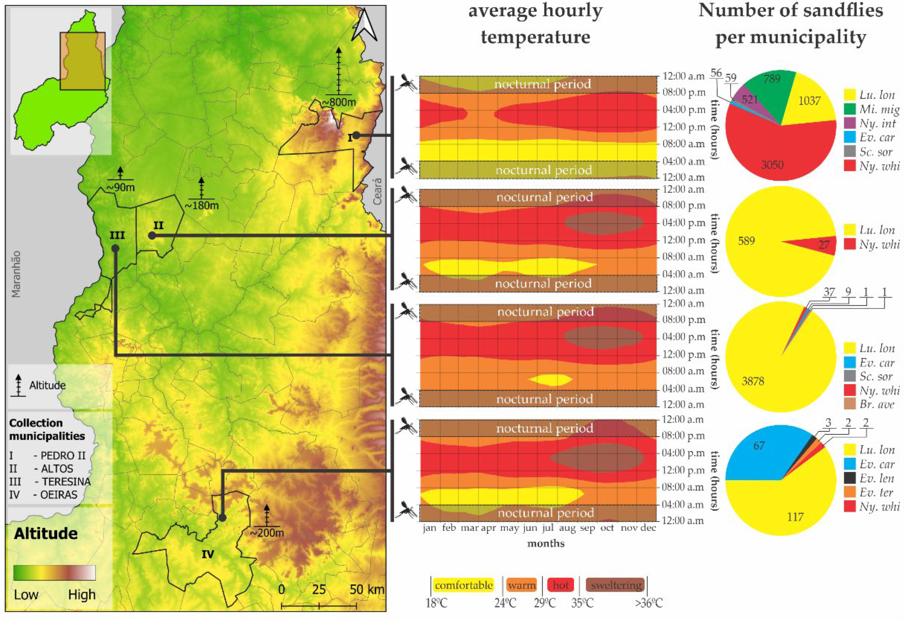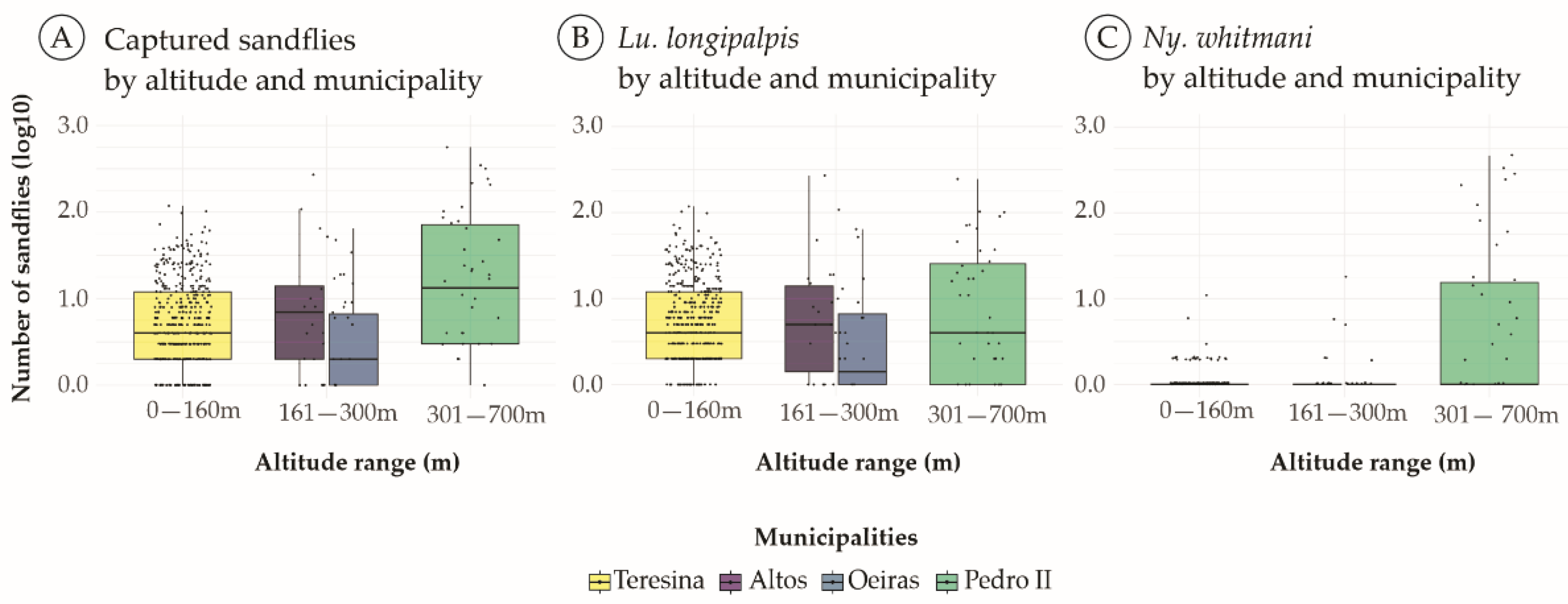 - de Sousa, R.L.T.; de Araujo-Pereira, T.; Leal, A.R.S.; Freire, S.M.; Silva, C.L.M.; Mallet, J.R.S.; Vilela, M.L.; Vasconcelos, S.A.; Gomes, R.; Teixeira, C.; et al. Association between the potential distribution of Lutzomyia longipalpis and Nyssomyia whitmani and leishmaniasis incidence in Piauí State, Brazil. PLoS Negl. Trop. Dis. 2023, 17, e0011388. [Google Scholar] [CrossRef]