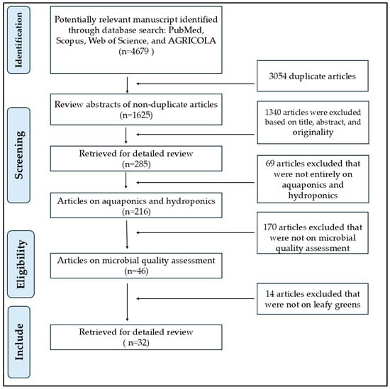 To refine the search, we excluded studies containing the terms “field” or “conventional” and focused on controlled-environment crop production. Manuscripts were screened based on titles and abstracts, followed by backward and forward citation tracking of key manuscripts to identify additional relevant literature. Studies were included only if they examined microbial contamination in aquaponic or hydroponic systems, with particular emphasis on leafy greens and fresh fruits. This approach ensured a comprehensive evaluation of available literature while summarizing key findings on pathogens associated with fresh produce in aquaponic and hydroponic production systems. In total, we reviewed 32 peer-reviewed research articles on the microbial profiles of leafy greens grown in aquaponic or hydroponic environments (Figure 1).