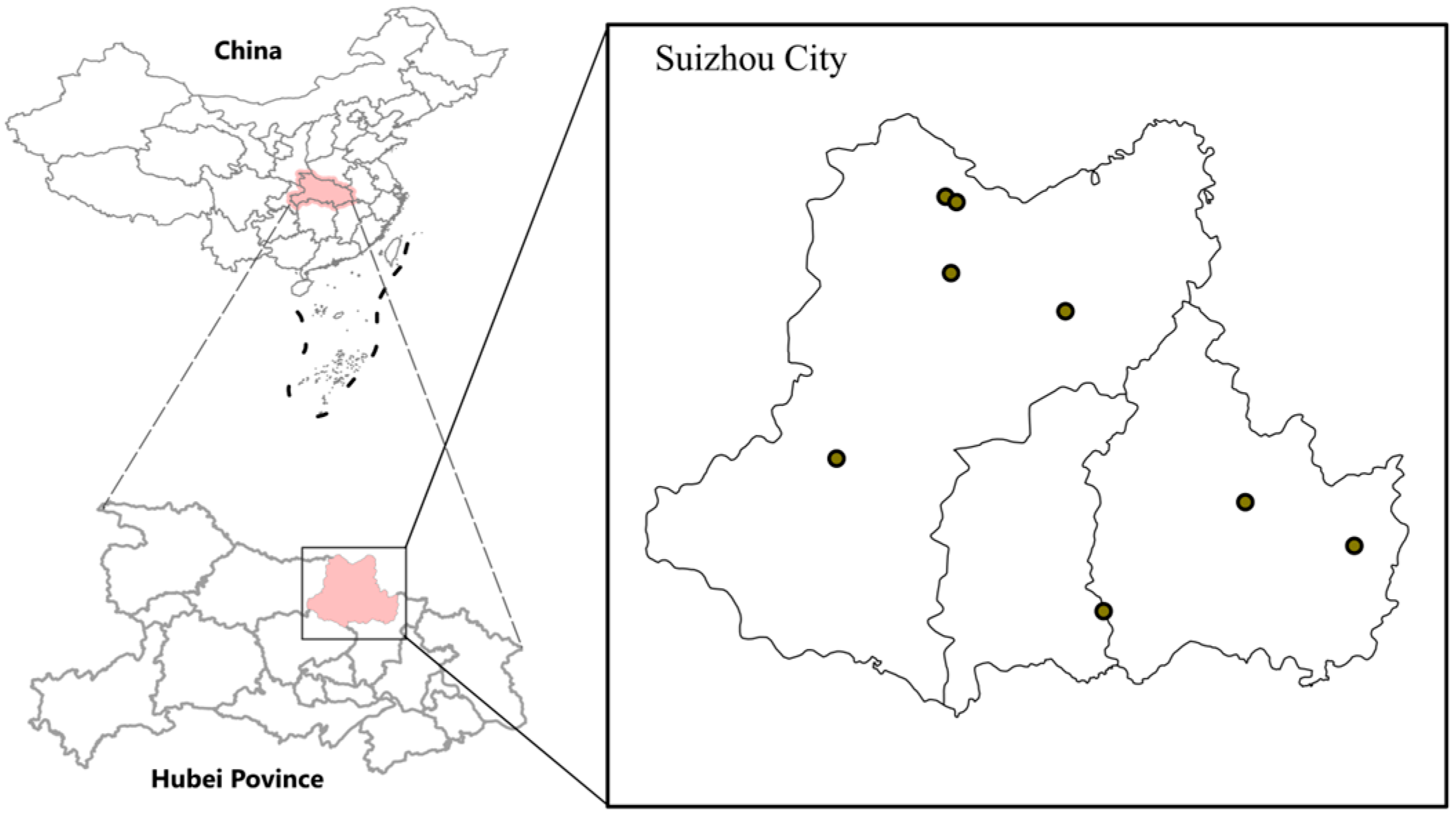 - Luo, Y.; Liu, L.; Huang, X.; Xu, J.; Liu, M.; Li, F.; Guan, X.; Tong, Y.; Wu, Y. Epidemiological investigation of an epidemic of severe fever with thrombocytopenia syndrome in a county in Hubei, 2023. Dis. Surveill. 2024, 39, 1085–1089. [Google Scholar] [CrossRef]