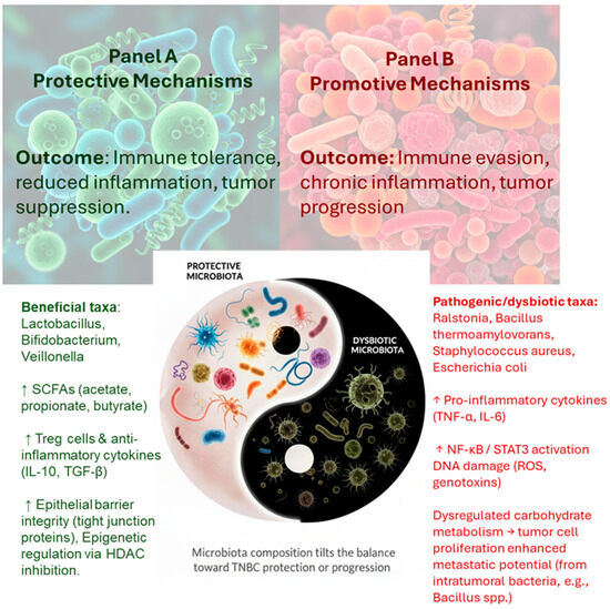 Protective and promotive mechanisms of the breast microbiota in TNBC. Beneficial taxa such as Lactobacillus and Bifidobacterium produce short-chain fatty acids (SCFAs), enhance regulatory T cell activity, increase IL-10 and TGF-β secretion, and maintain epithelial barrier integrity, thereby contributing to immune tolerance and tumor suppression. In contrast, dysbiotic taxa including Ralstonia, Staphylococcus aureus, and intratumoral Bacillus species promote pro-inflammatory cytokine release (TNF-α, IL-6), activation of NF-κB and STAT3 signaling, DNA damage, and metabolic reprogramming, ultimately favoring tumor growth, immune evasion, and metastasis. The balance between protective and pathogenic microbes may critically influence TNBC occurrence and progression [18,47,52].