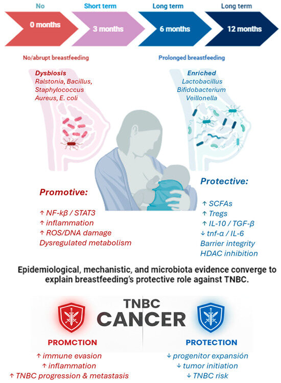 Finally, understanding how breast microbiota evolves throughout pregnancy, lactation, and involution remains a key research priority. Longitudinal studies tracking these microbial and immuno-hormonal dynamics in high-risk women could elucidate critical windows for intervention. Identifying microbial markers that predict TNBC risk, or that reflect early carcinogenic changes, may also inform future diagnostic and preventive strategies. Figure 4 presents an integrative model illustrating how breastfeeding influences the microbiota, thereby shaping immune and metabolic pathways that determine TNBC protection or progression. The integrative mechanisms illustrated in Figure 2, Figure 3 and Figure 4 are supported by epidemiological and microbiota evidence summarized in Supplementary Table S1.