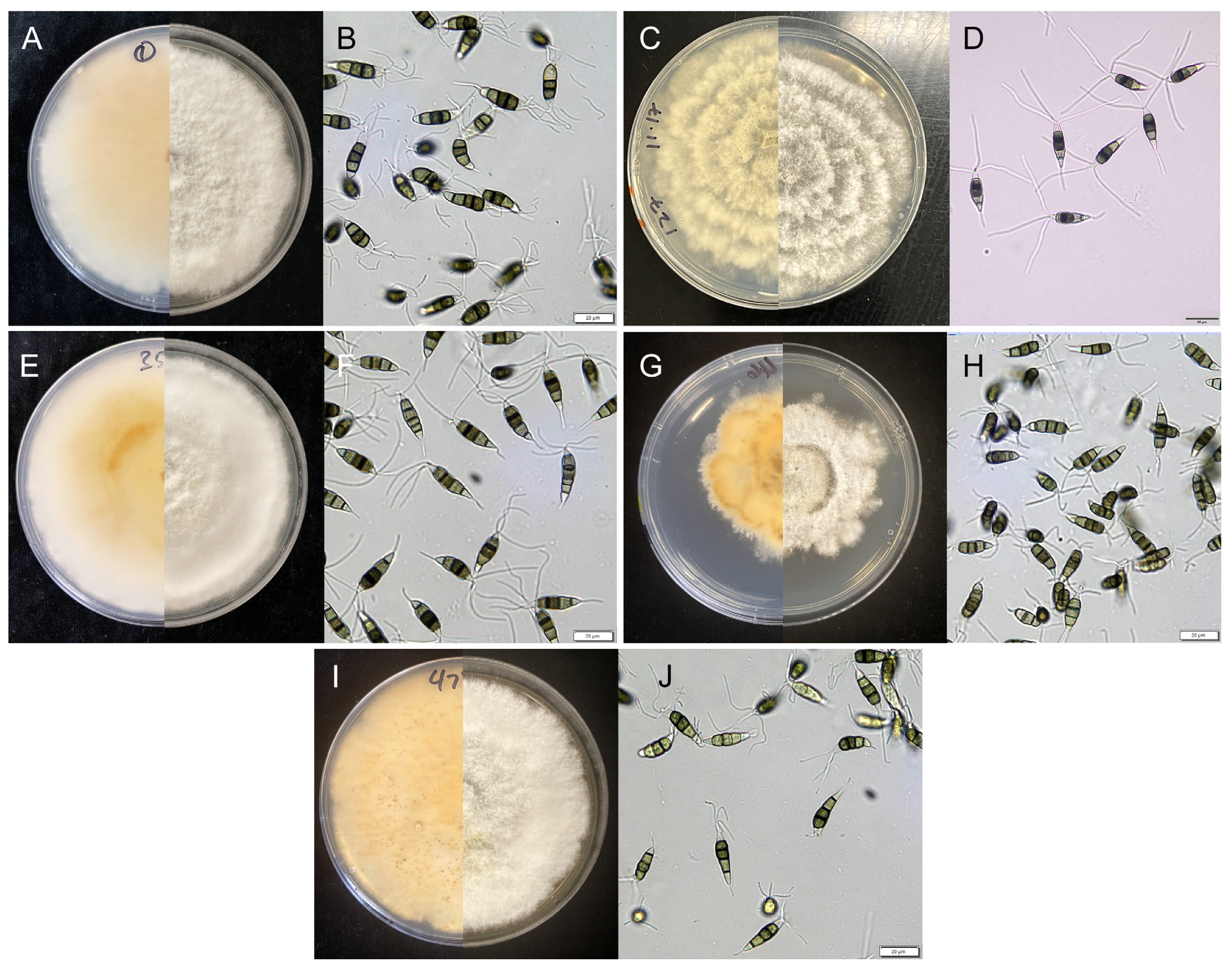 2.1. Pathogen Isolation and Morphological Characterization