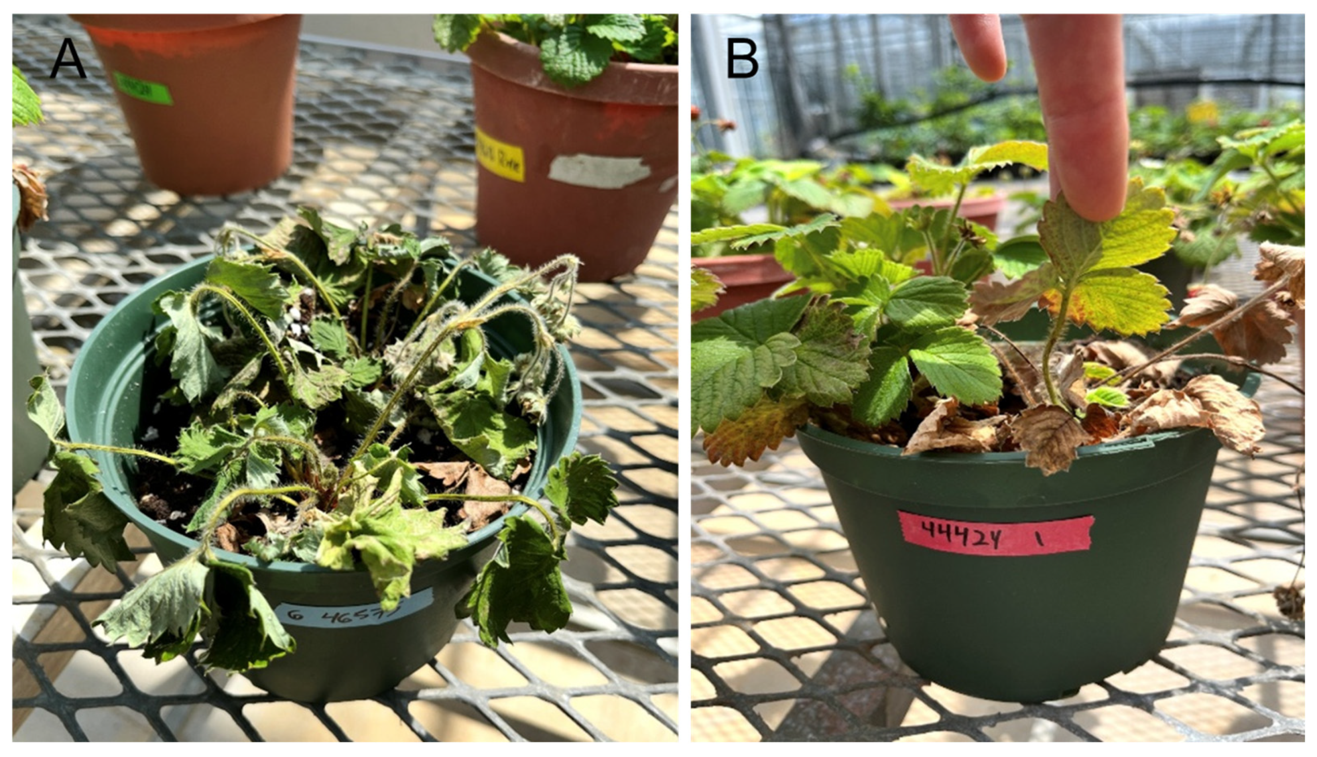 - Fang, X.; Phillips, D.; Verheyen, G.; Li, H.; Sivasithamparam, K.; Barbetti, M.J. Yields and resistance of strawberry cultivars to crown and root diseases in the field, and cultivar responses to pathogens under controlled environment conditions. Phytopathol. Mediterr. 2012, 51, 69–84. [Google Scholar]