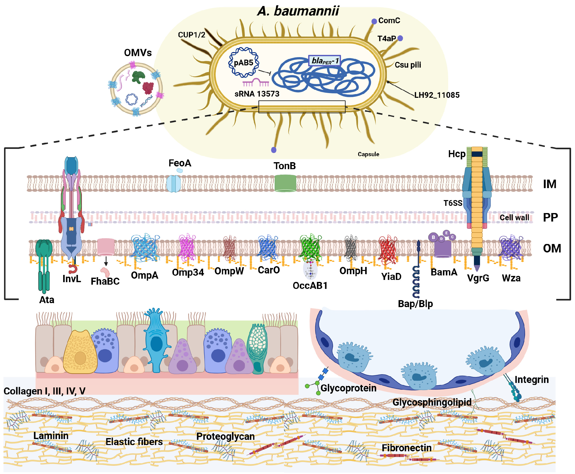 | AbFhaB/FhaC | AbH12O-A2 | In vitro (A549 cells); In vivo (Caenorhabditis. elegans and BALB/c mice) | Filamentous hemagglutinin proteins involved in ECM binding and cell adhesion. | Fibronectin | [25] |