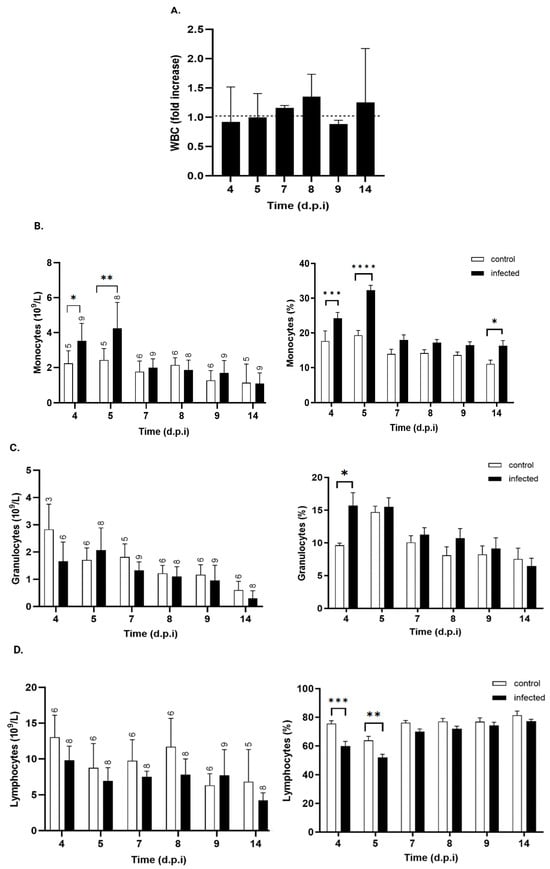 During the same period, no significant changes were observed in the absolute counts of granulocytes (Figure 5C) or lymphocytes (Figure 5D). The relative distributions of leukocyte subsets also showed significant increases in the percentage of monocytes at days 4 and 5 p.i. (Figure 5B) and a higher granulocyte percentage in infected mice by day 4 p.i. (Figure 5C), suggestive of early innate immune activation. This increase was short-lived, with granulocyte percentages returning to baseline levels by day 5 p.i. Conversely, the percentage of lymphocytes in infected mice decreased significantly on days 4 and 5 (Figure 5D), returning to control values by day 7 p.i. From that point onward, lymphocyte proportions remained stable, with no significant differences between groups recorded up to day 14 p.i.