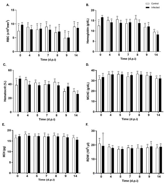 Erythrocyte parameters did not differ significantly between the T. cruzi-infected and control groups. Total red blood cell (RBC), hemoglobin, hematocrit, mean corpuscular hemoglobin concentration (MCHC), mean corpuscular hemoglobin (MCH), and red cell distribution width (RDW) values (Figure 6A–F, respectively) remained stable and similar between the groups throughout the infection period.