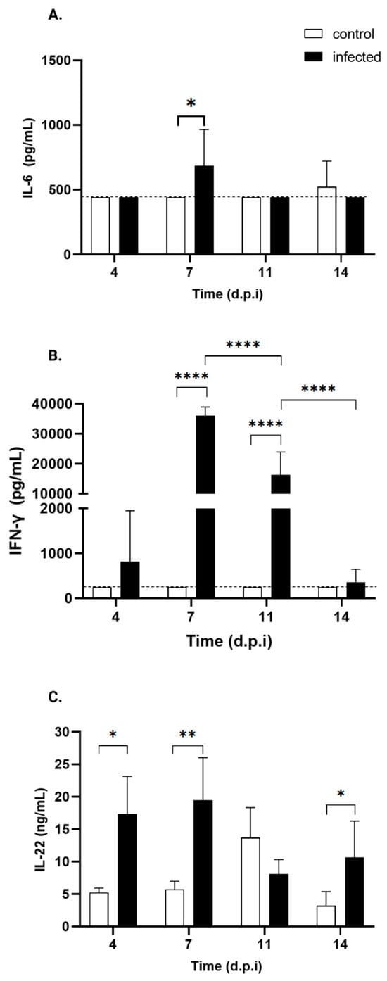 Contrary to the other two factors, LDH serum levels (Figure 4C) remained unchanged and similar to those of non-infected mice throughout the experiment.