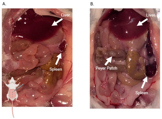 A macroscopic inspection of the organs was performed, and photographic images were acquired for comparison between control and infected animals. The heart, spleen, liver, esophagus, and colon were collected from each animal; immediately placed into pre-chilled tubes on ice; and washed with sterile saline at 4 °C. Organs were then weighed, and their weights were expressed as a percentage of the total body weight of each animal.