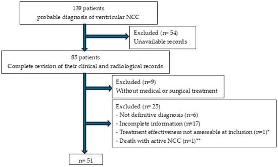 Patient enrollment flowchart for the study. * At the time of this study, the patient had received cysticidal treatment less than 6 months earlier. ** Patient who underwent surgical treatment and died from surgical complications before the parasites became inactive.